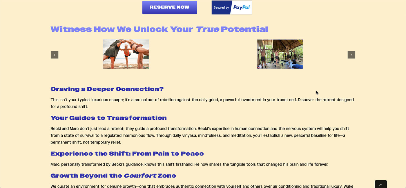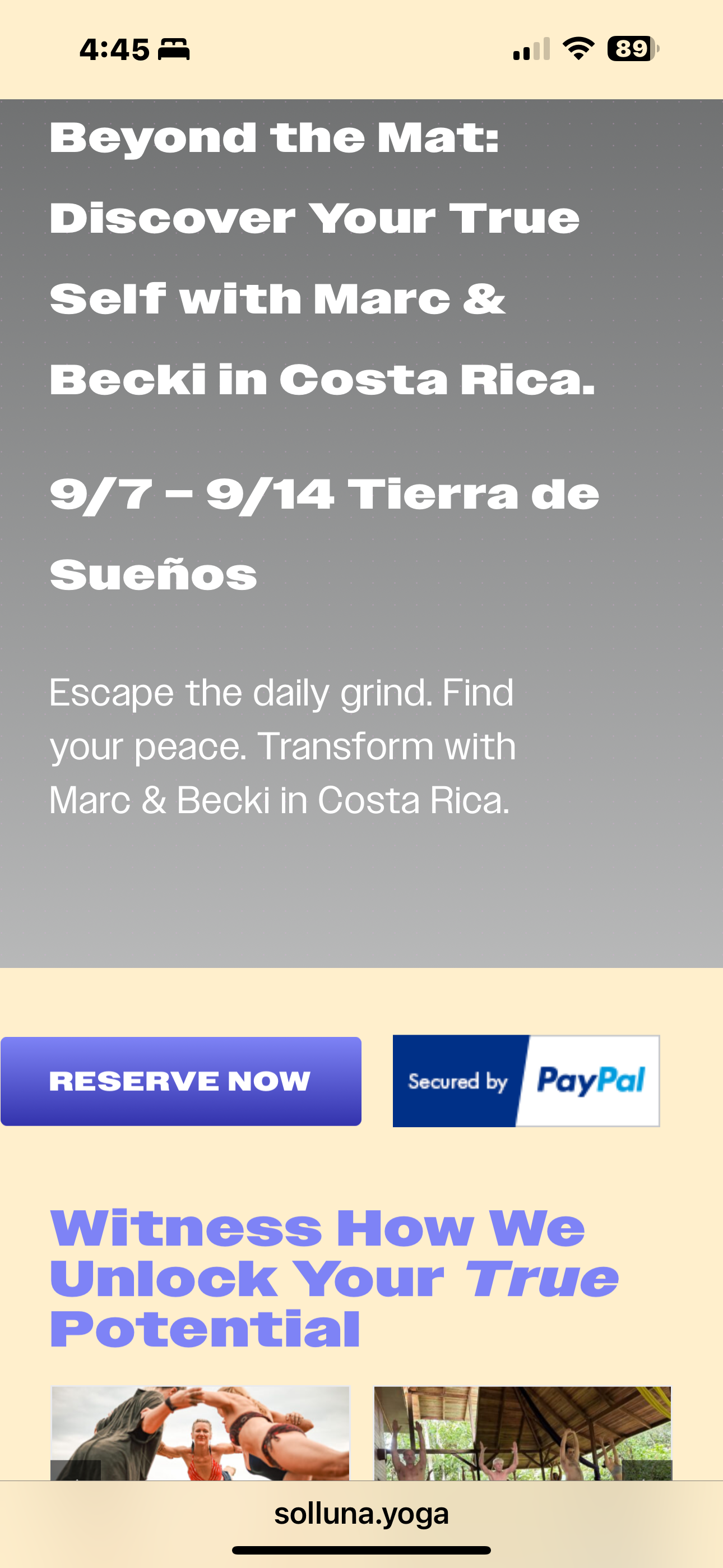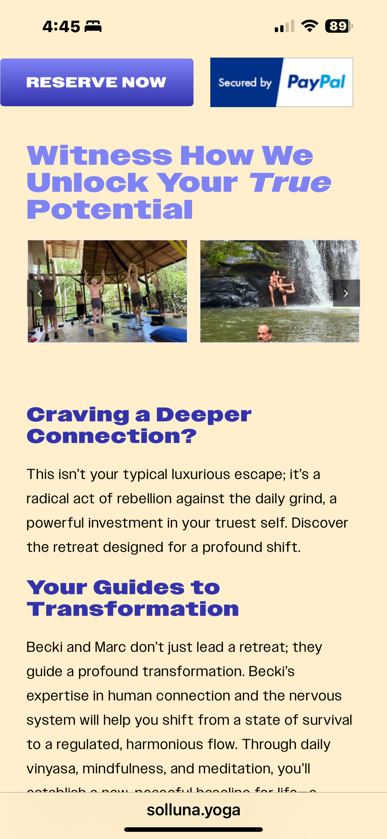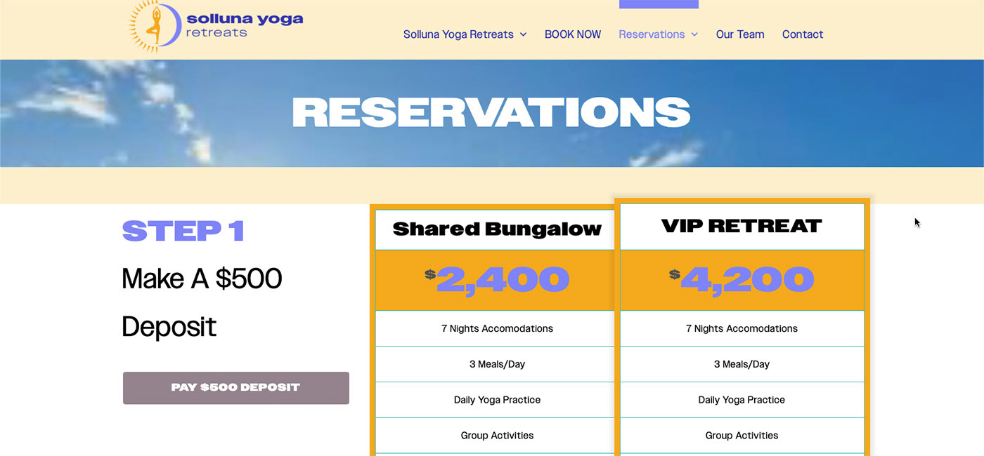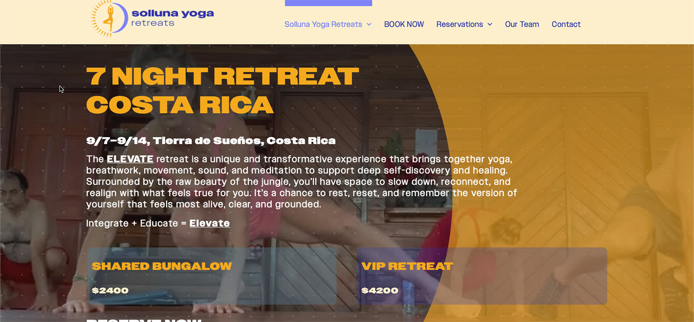 I strategically opted to incorporate the brand name into the URL with the use of a custom domain extension, .yoga. This strategy makes finding the website easy and memorable when the logo is printed on branded materials. The main function of the website is to inform customers of the brand, provide details about the retreats, and collect payments.