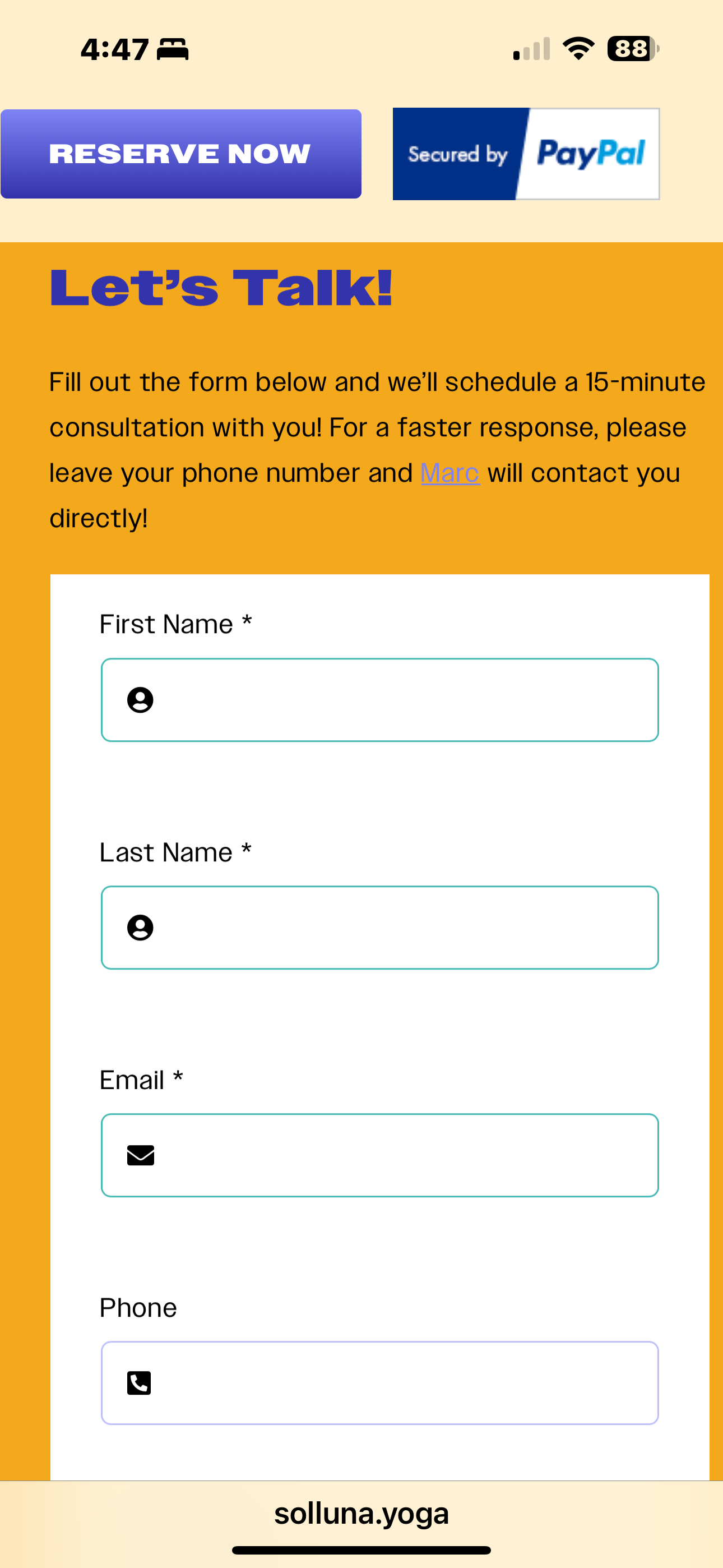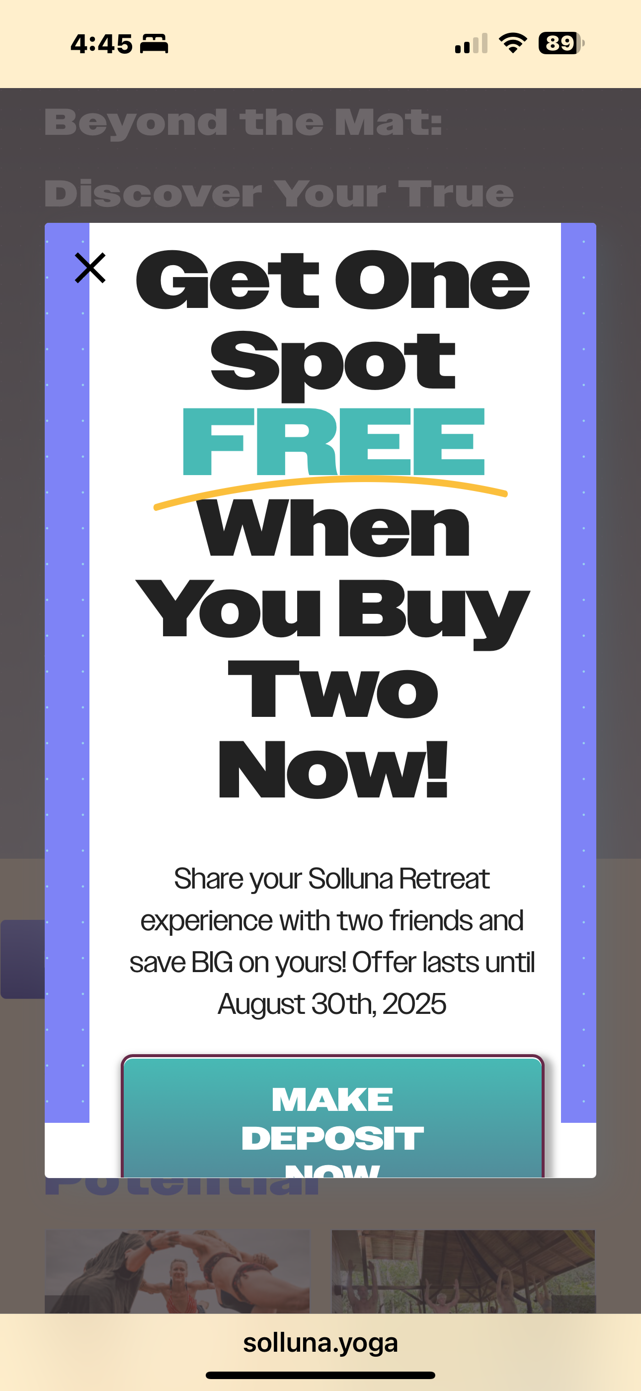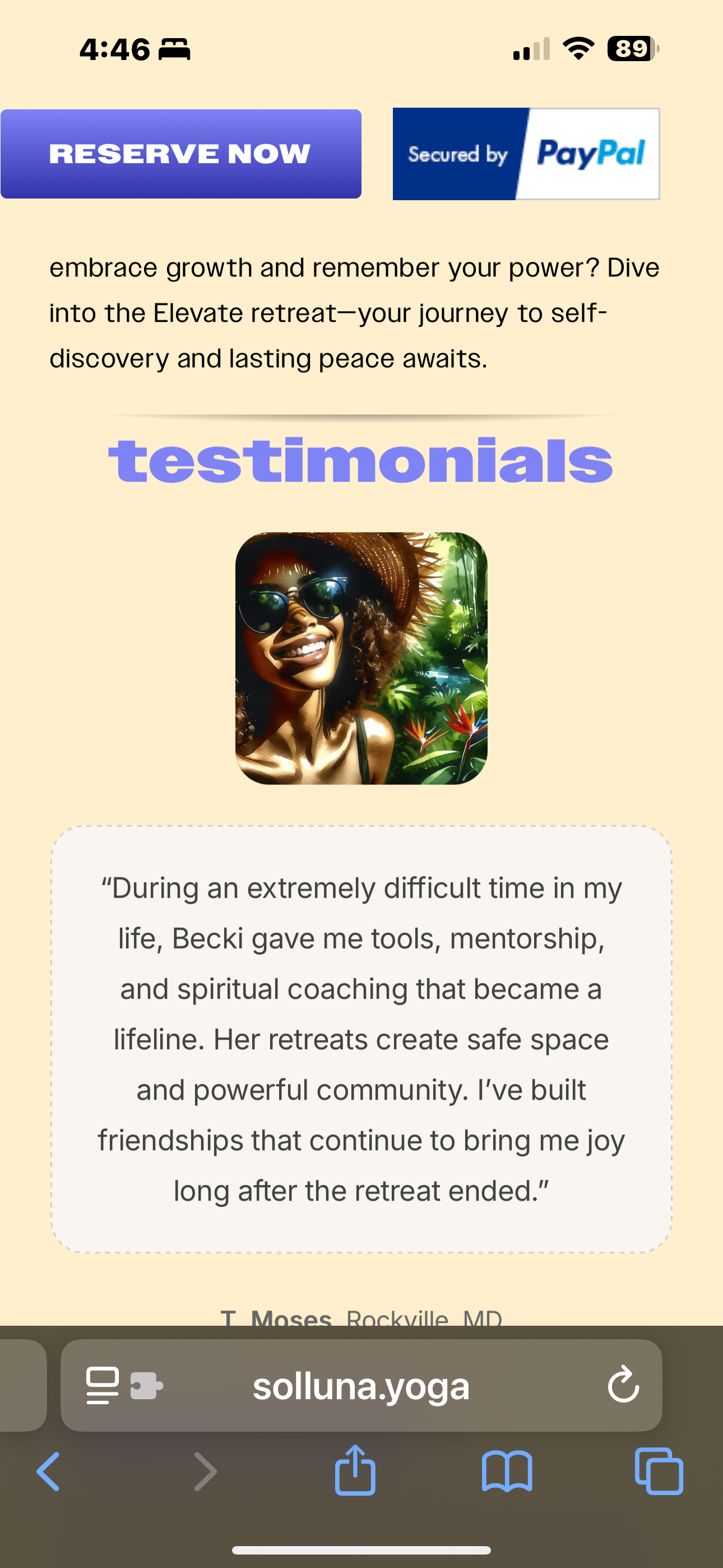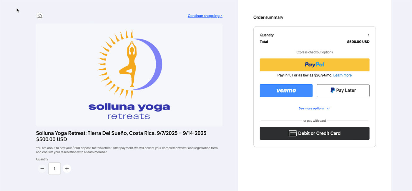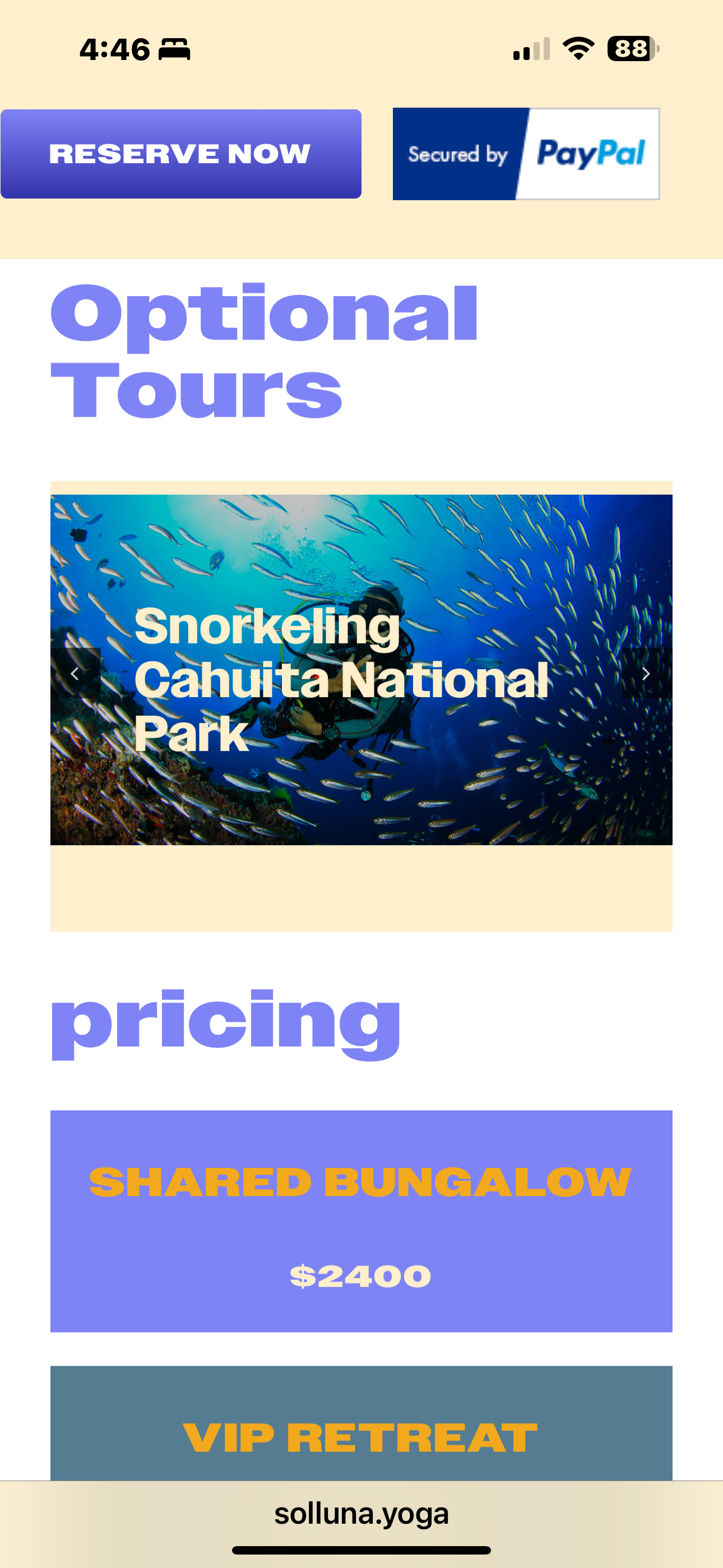 I strategically opted to incorporate the brand name into the URL with the use of a custom domain extension, .yoga. This strategy makes finding the website easy and memorable when the logo is printed on branded materials. The main function of the website is to inform customers of the brand, provide details about the retreats, and collect payments.