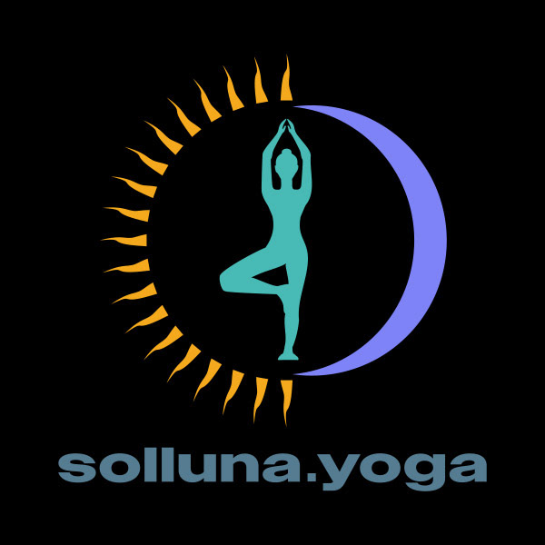 The word 'Solluna' encompasses the Latin words for 'Sun' and 'Moon,' which together symbolize the balance of personal energies (Yin and Yang, for example). The logo was designed to depict this synergy of energies by illustrating a yogi practicing a Tree Pose (a Sun Salutation element) encapsulated by the sun's rays on the left and the crescent of the moon on the right, within a perfect circle symbolizing wholeness.